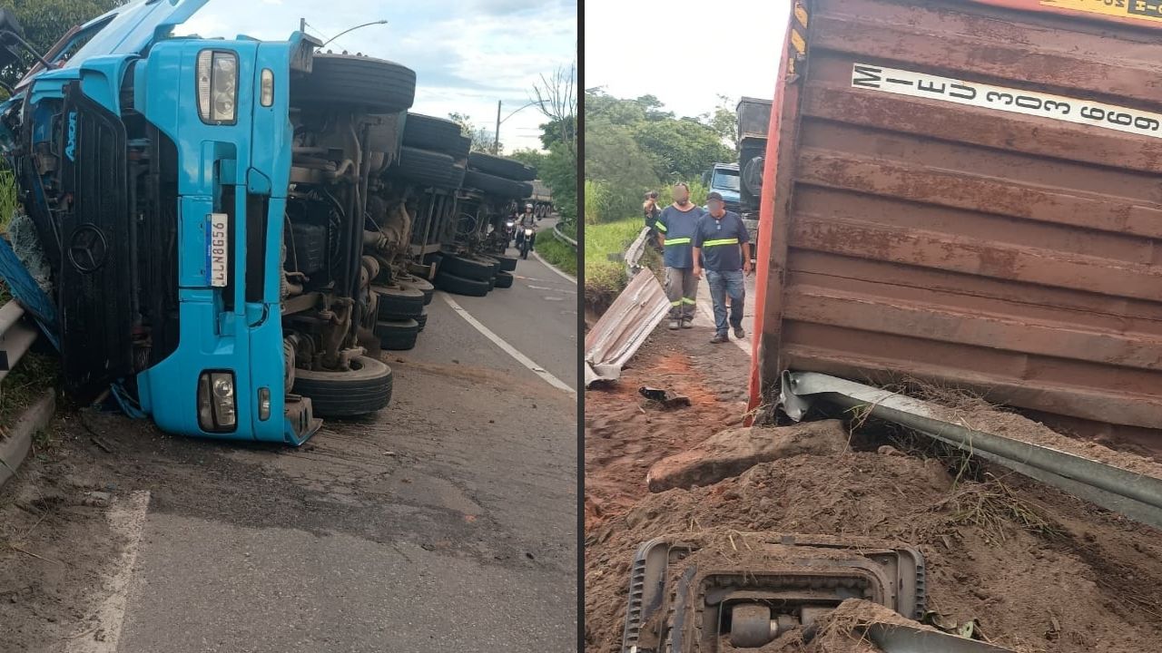 Caminhão tombado e batida entre basculantes causaram bloqueio total na BR-101 Sul, em Santa Cruz; passagem de veículos leves já foi liberada