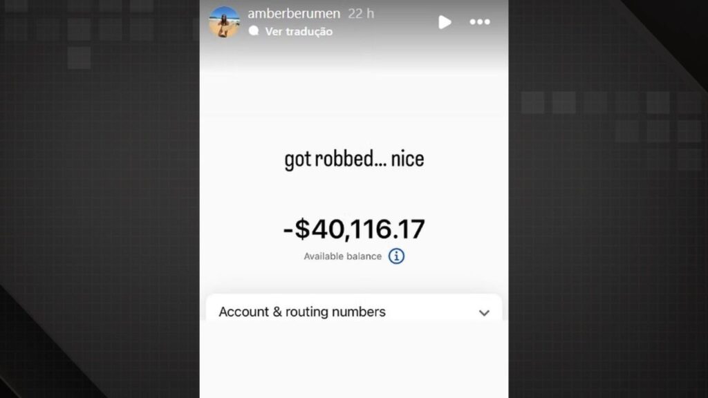 Depois do furto, os criminosos acessaram a conta bancária de Amber e retiraram dinheiro até deixá-la negativa em mais de 40 mil dólares (R$ 210 mil). Ela afirma ainda que eles entraram no seu e-mail, trocaram a senha e alteraram o idioma da conta para o português.