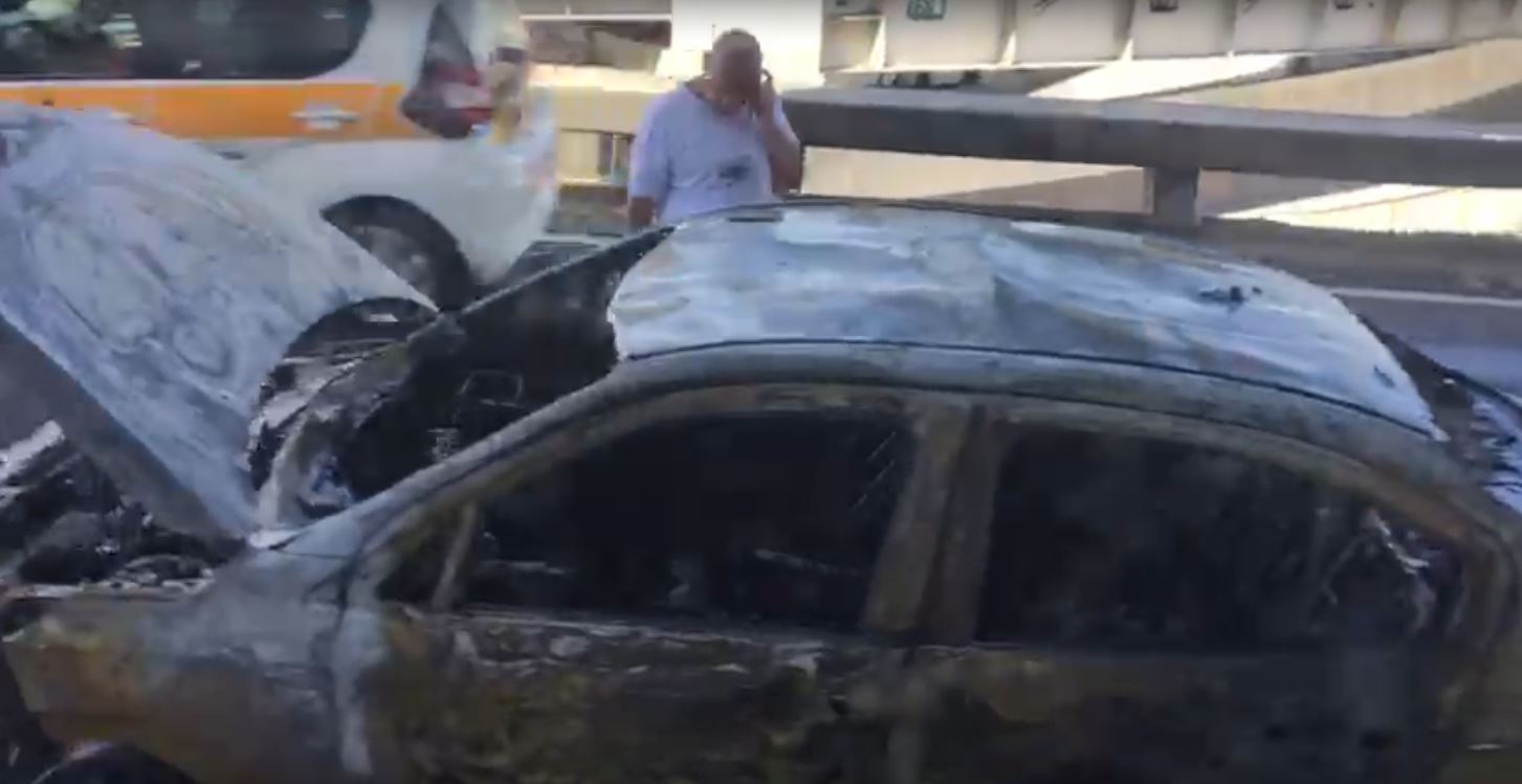 Veículo pegando fogo complica trânsito em acesso à Avenida Brasil