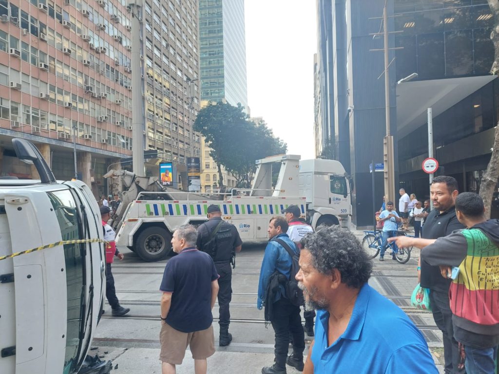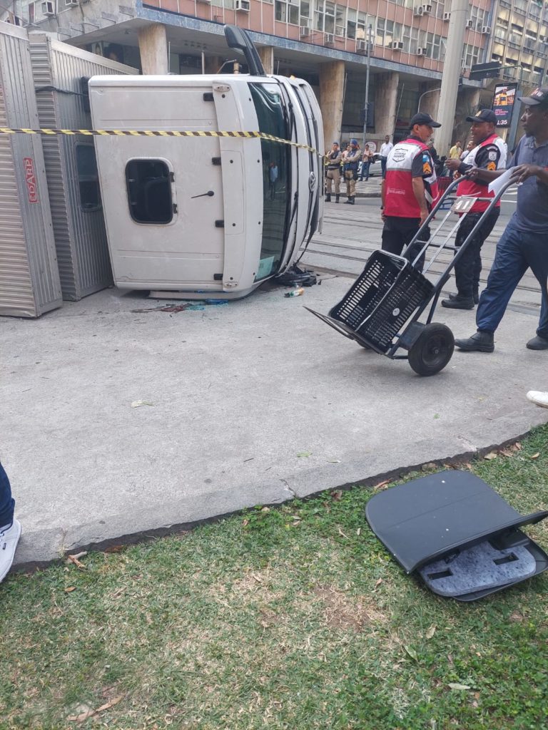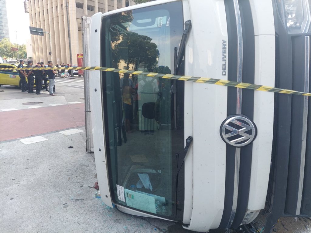 Um caminhão tombou após uma viatura da Polícia Militar bater no veículo na Avenida Rio Branco, no Centro do Rio, na manhã desta segunda-feira (17). A colisão ocorreu no cruzamento entre as avenidas Rio Branco e Almirante Barroso por volta das 10h30.