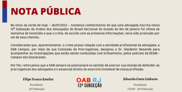 Uma advogada de 27 anos, identificada apenas como Maiara, ficou ferida após levar quatro tiros, no escritório onde trabalha, dentro de um shopping, em Campos dos Goytacazes, no Norte do Estado. O caso aconteceu nessa quarta-feira (26), quando ela foi surpreendida por um homem armado identificado por ela como Diego Dourado, que invadiu a sala.