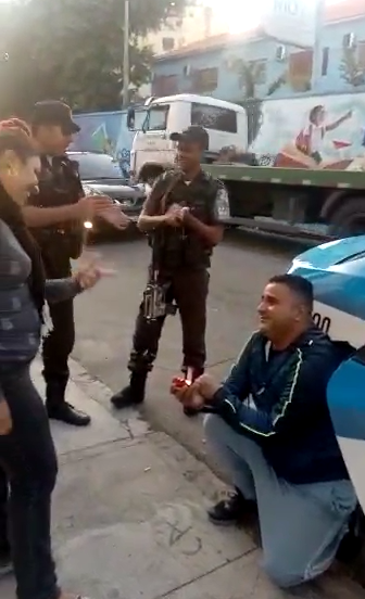 Marcos fingiu que tinha recebido voz de prisão dos policiais para enganar a namorada, que ficou nervosa com toda situação. Os agentes fingiram que iam prender Marcos, alegando que ele estaria dirigindo um carro adulterado. Shirley também ‘recebeu voz de prisão’ e enquanto ia buscar a bolsa no carro, um PM entregou a aliança para Marcos, que ajoelhou e fez o pedido.