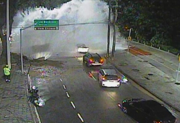 A Avenida Borges de Medeiros, na Lagoa, na Zona Sul do Rio, está interditada, no sentido Rebouças, por conta de um vazamento muito grande de água, próximo ao Clube Naval Piraquê. É um chafariz tão grande que chega a ultrapassar um poste de sinalização.