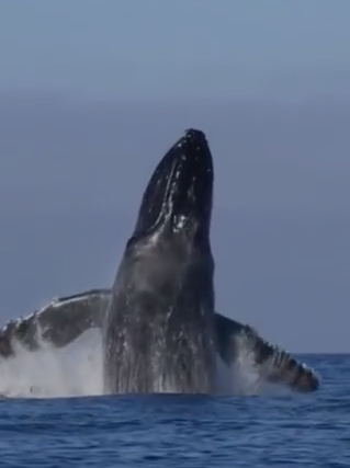 As imagens mostram o momento em que a baleia dá um bote e esguicha água para o alto.