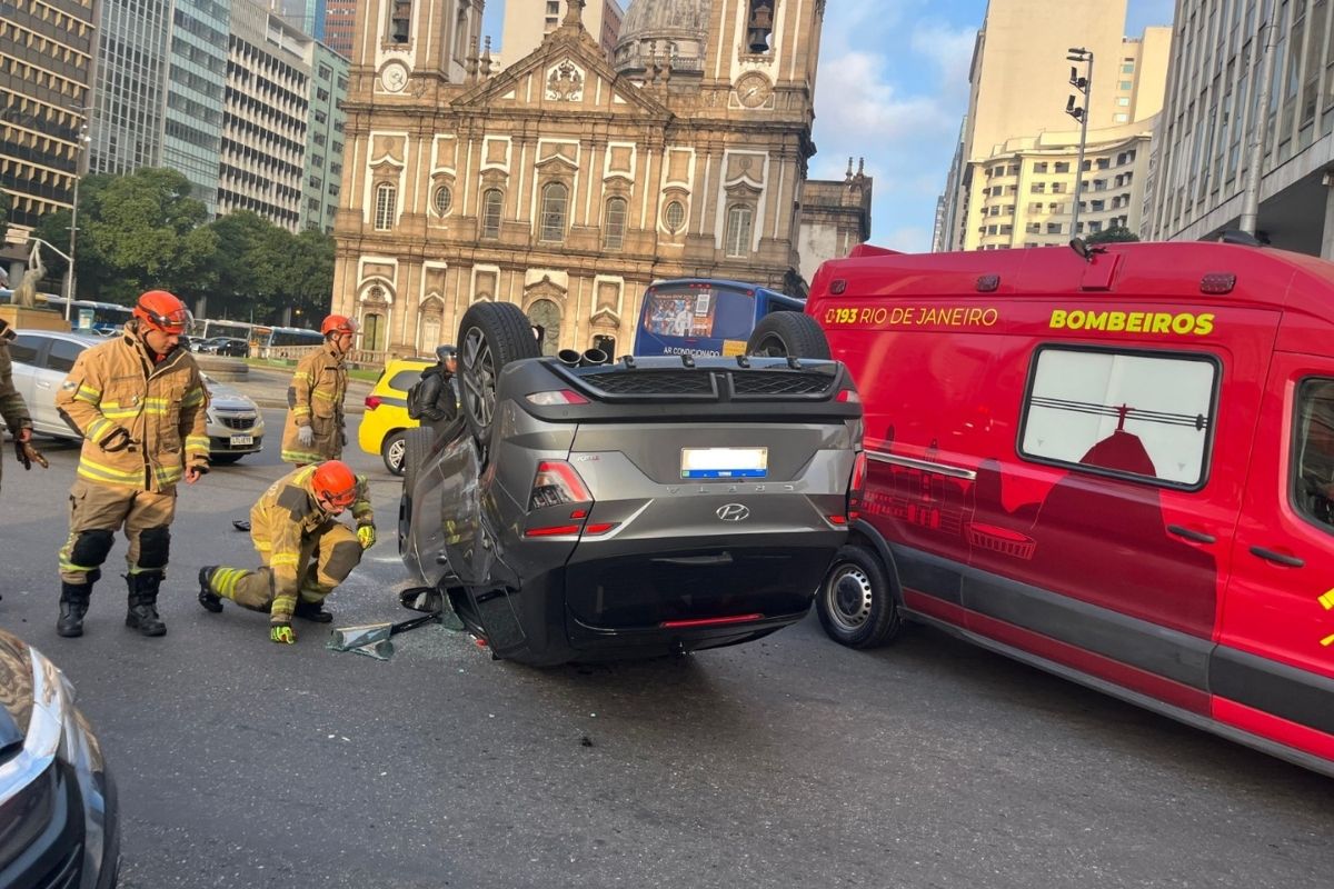 Um carro capotou após colidir com um ônibus no cruzamento da Avenida Presidente Vargas com a Rua Primeiro de Março, no Centro do Rio. O acidente aconteceu na manhã desta terça-feira (8), por volta das 7h30.