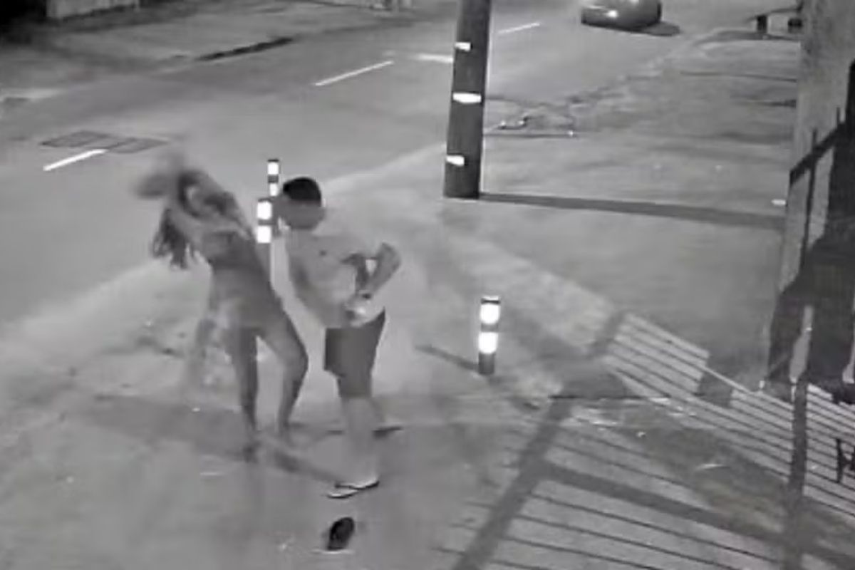 Nas cenas, o casal sai de um portão e, já na calçada, o agressor empurra a vítima no chão, levantando-a pelos cabelos. Em seguida, ele desfere socos no rosto da jovem e chutes enquanto ela está caída.