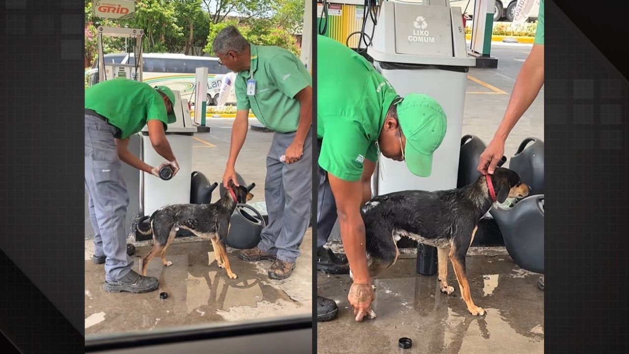 Vídeo: funcionários de posto param tudo para dar banho em cachorro e cena viraliza