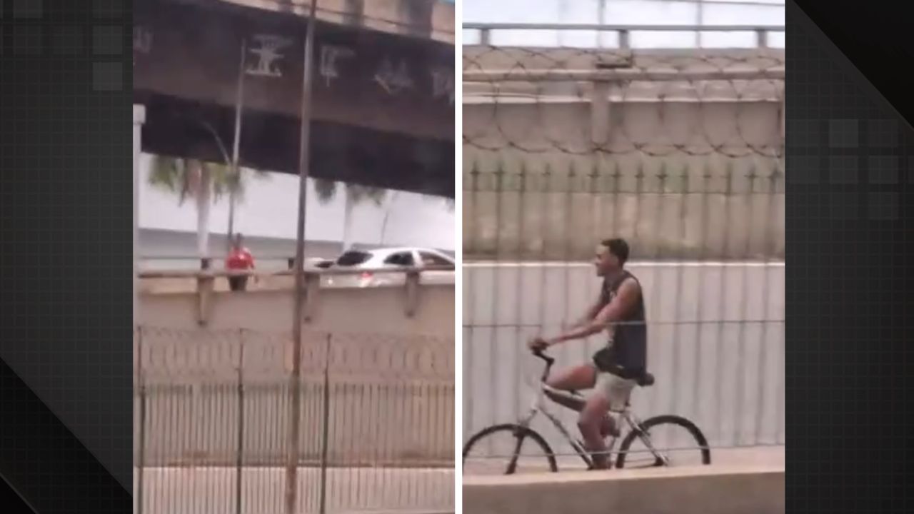 Nas imagens, é possível ver uma mulher aproveitando o engarrafamento para tentar atingir um veículo, enquanto um jovem de bicicleta dá cobertura. Um dos veículos que passava pelo local teve os vidros quebrados por uma pedra.