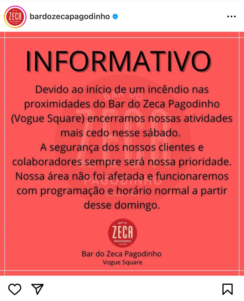 De acordo com comunicado publicado nas redes sociais do bar, as atividades do estabelecimento foram encerradas mais cedo. A postagem ainda alega que a área não foi afetada. Em contato com a Super Rádio Tupi, a assessoria de imprensa do Bar do Zeca informou que o estabelecimento já está aberto ao público neste domingo (4).