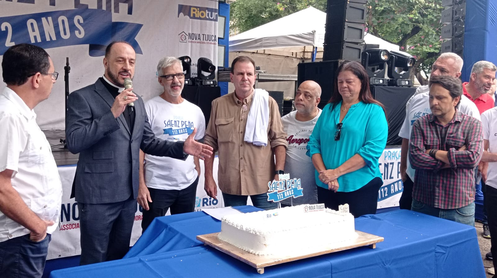 O prefeito Eduardo Paes, o subprefeito da Grande Tijuca, Felipe Quintans, e o presidente da Riotour, Ronnie Costa, participaram, na manhã deste sábado (13) do evento de comemoração dos 112 anos da Praça Sáenz Peña, na Tijuca, na Zona Norte da Cidade.