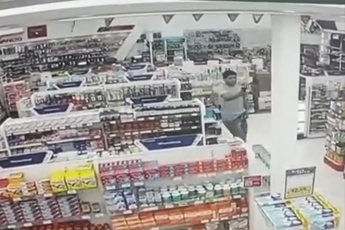 No interior da farmácia, um homem de casaco preto e uma mulher de casaco rosa aparecem andando entre as prateleiras. Outro integrante do bando, de casaco vermelho e capacete, é visto deixando o local com sacolas cheias de produtos.