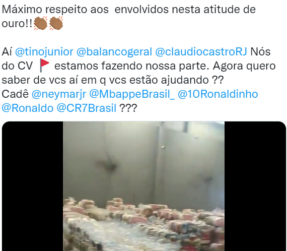 Traficantes do Comando Vermelho se mobilizam para arrecadar doações e enviar à população atingida pela tragédia em Petrópolis, na Região Serrana. Numa publicação nas redes sociais é possível ver diversas cestas básicas enfileiradas dentro de um galpão. Os bandidos, inclusive debocharam das autoridades e disseram que estão fazendo a parte deles.