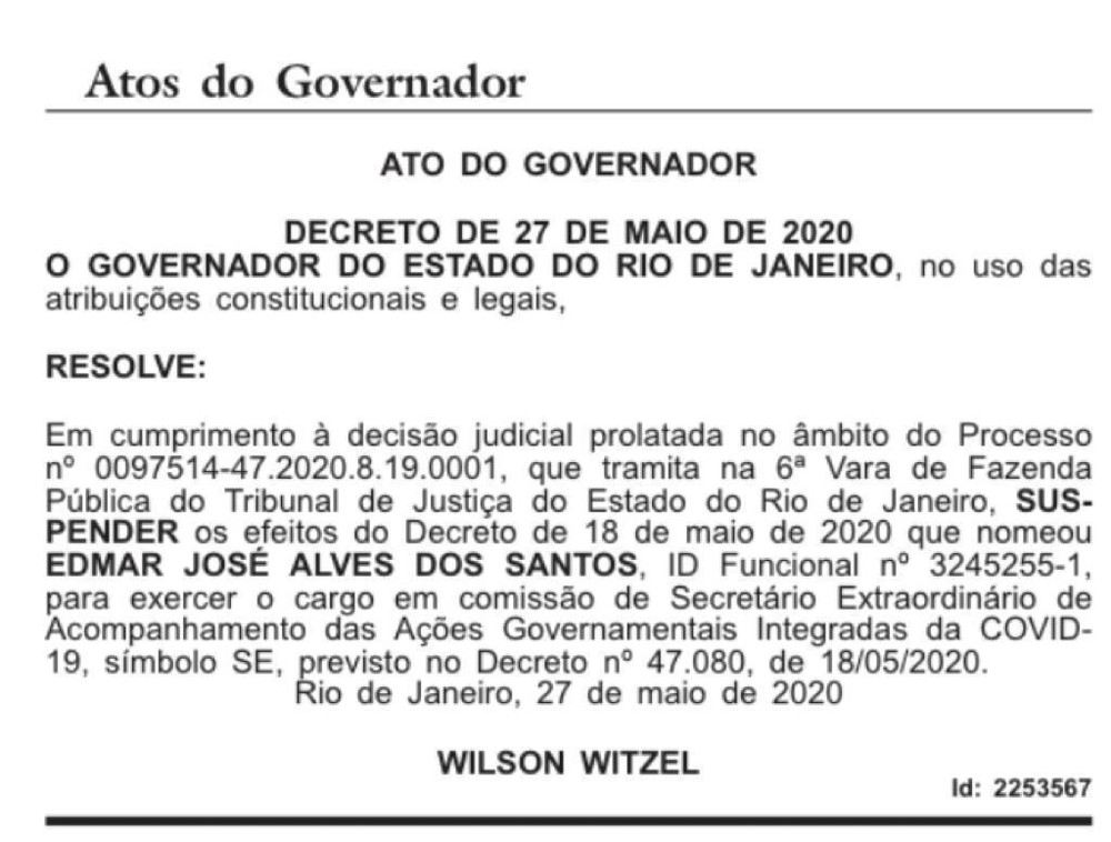 O Governo do Estado suspendeu a nomeação de Edmar Santos como secretário Extraordinário de Acompanhamento das Ações Governamentais Integradas da Covid-19. A suspensão foi publicada no Diário Oficial do Estado do Rio de Janeiro, nesta quinta-feira.