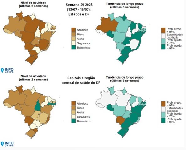 O InfoGripe é uma estratégia do Sistema Único de Saúde (SUS), voltada ao monitoramento de casos de SRAG no país, oferecendo suporte às vigilâncias em saúde na identificação de locais prioritários para ações, preparações e resposta a eventos em saúde pública. A atualização é referente à Semana Epidemiológica 29, de 13 a 19 de julho.