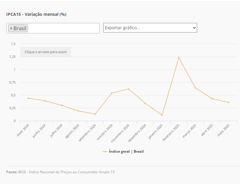 O acumulado no ano ficou em 2,80%, enquanto o acumulado em 12 meses foi de 5,40%. Em maio de 2024, o IPCA-15 havia registrado alta de 0,44%.