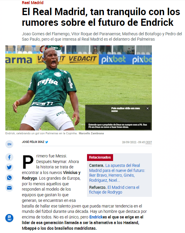 O veículo também destacou que o Real Madrid tem perfeito conhecimento do mercado brasileiro, o que não quer dizer que qualquer jovem com destaque no país vá ser contratado de imediato. O clube busca jogadores diferenciados e aguarda o momento certo de investir.