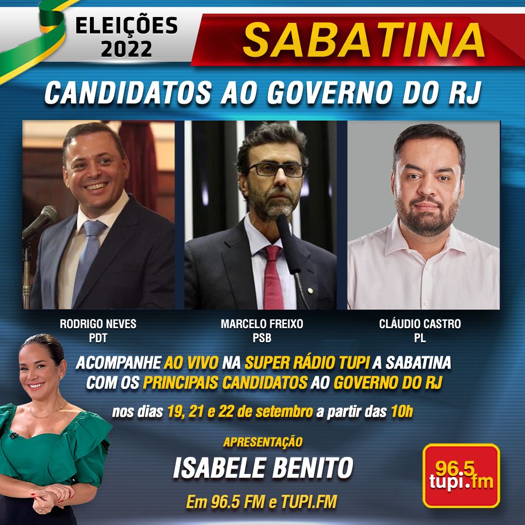 A Super Rádio Tupi realiza, a partir da próxima segunda-feira (19), uma sabatina com os candidados ao governo do Rio de Janeiro.