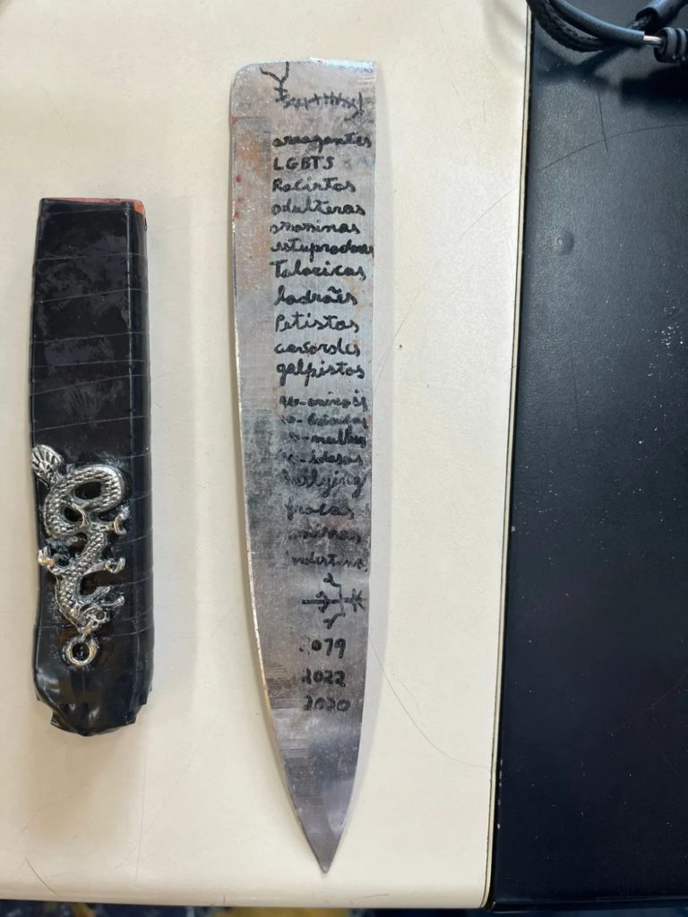 Após a prisão de Mateus Marinho, a Polícia Civil apreendeu a arma usada no crime. Na faca tinham palavras escritas como: petistas, LGBT’s, nordestinos e adúlteros.