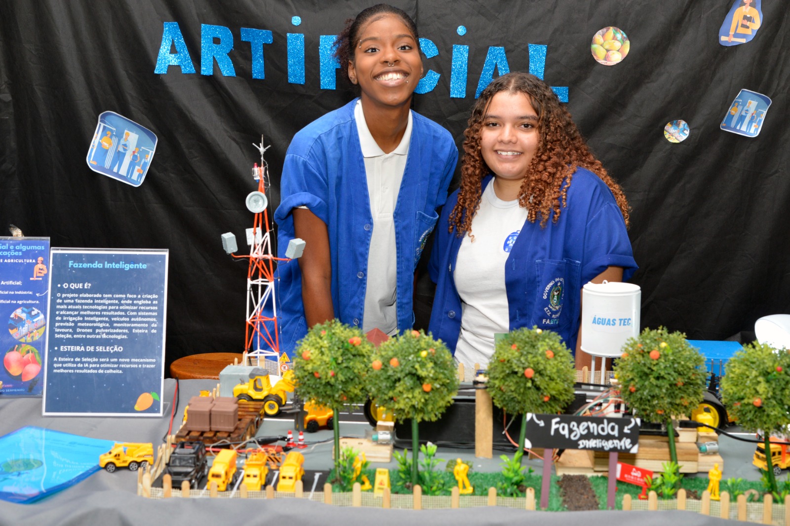O projeto “Inteligente Artificial e suas aplicações” foi desenvolvido pelas alunas do 3º ano do curso Técnico em Telecomunicações, Maria Eduarda Domingos, 18 anos e Rana Gabrielle Servilha, 17 anos, demonstrando como alimentos de cores diferentes poderiam ser abastecidos por esteiras, automaticamente, em diferentes caminhões, ao mesmo tempo, para transporte.
