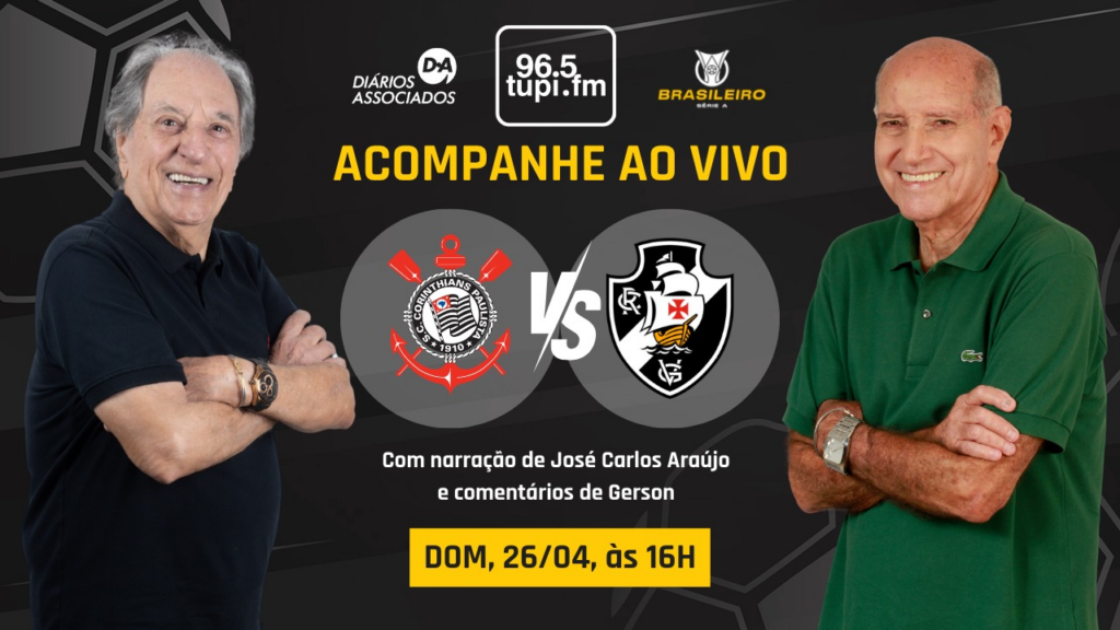 Não perca nenhum detalhe de Corinthians x Vasco ao vivo na transmissão completa da Super Rádio Tupi. A jornada esportiva começa às 15h e acompanha todos os lances do confronto direto da Neo Química Arena.