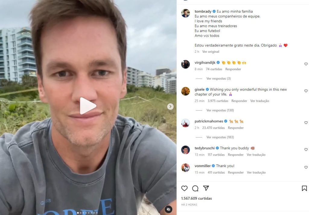 Tom Brady anunciou nesta quarta-feira sua aposentadoria da NFL, após 23 temporadas na liga. Considerado por muitos o melhor jogador da história, ele conquistou sete vezes o título do Super Bowl. Aos 45 anos, essa é a segunda vez em que o quarterback se despede do esporte, a primeira foi na última temporada. Desta vez, segundo ele, é ‘de verdade’.