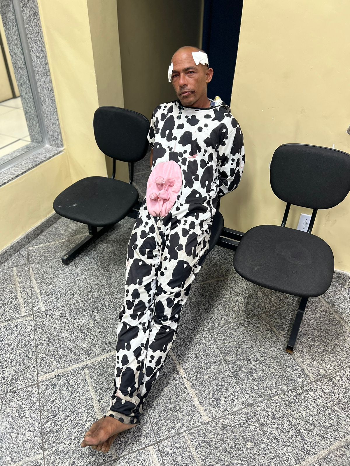 Policiais Militares conduziram para a delegacia um homem fantasiado de vaca, inicialmente acusado por tentativa de roubo, na noite desta sexta-feira (28), na Avenida Princesa Isabel, em Copacabana, Zona Sul do Rio.