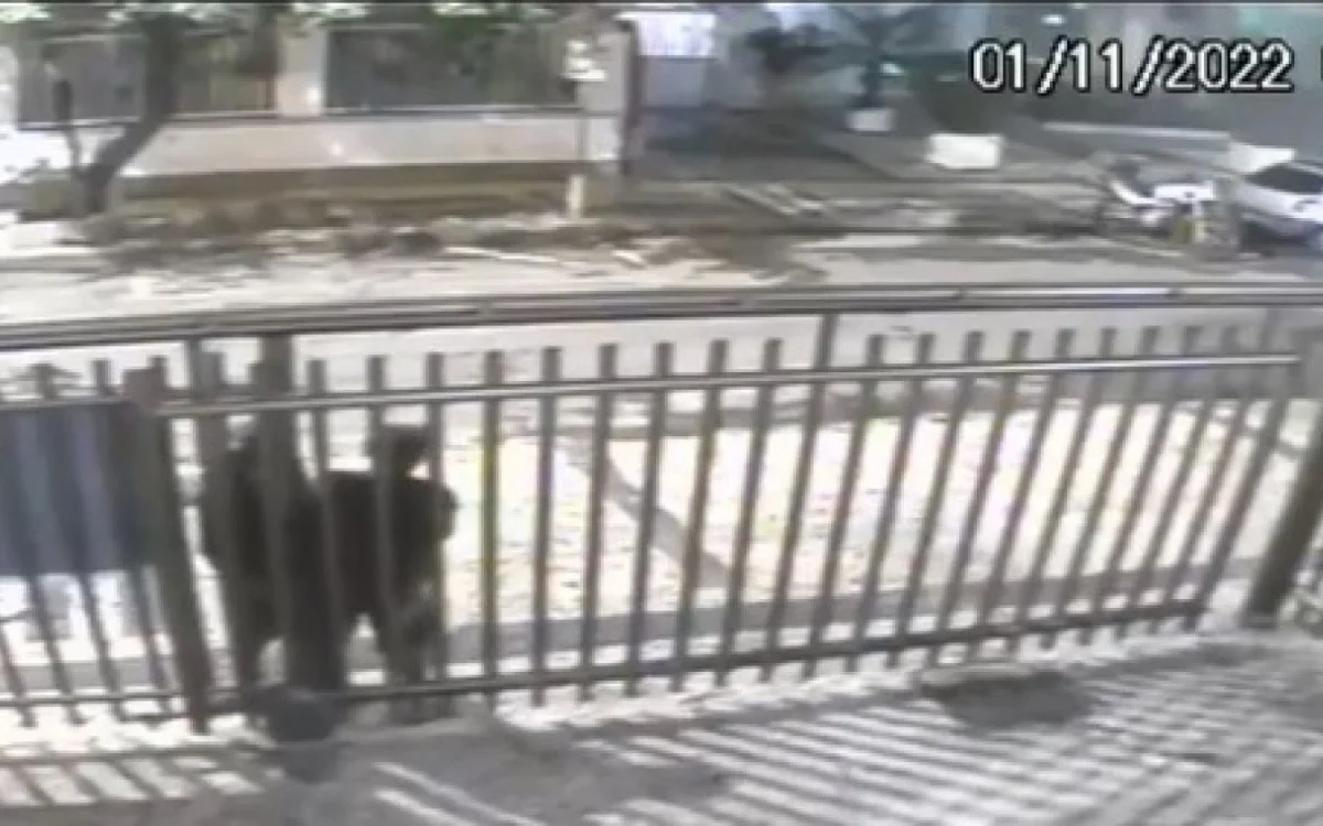 É possível ver os dois suspeitos forçando o portão eletrônico de entrada do prédio e subindo pelo andaime. O primeiro, desce oito minutos depois com um computador na mão. Em seguida, o comparsa desce e pega das mãos do outro homem uma mala de viagem, uma televisão e mais um computador, além de garrafas de bebida alcoólica.