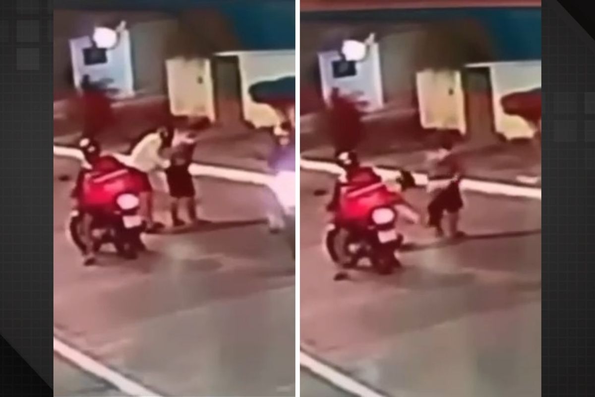 As imagens mostram o momento em que a vítima é surpreendida por três homens armados que chegam em duas motos. Um dos assaltantes usava uma bolsa de entregador de aplicativo. A vítima teve uma arma apontada para a cabeça e foi agredida durante a abordagem.