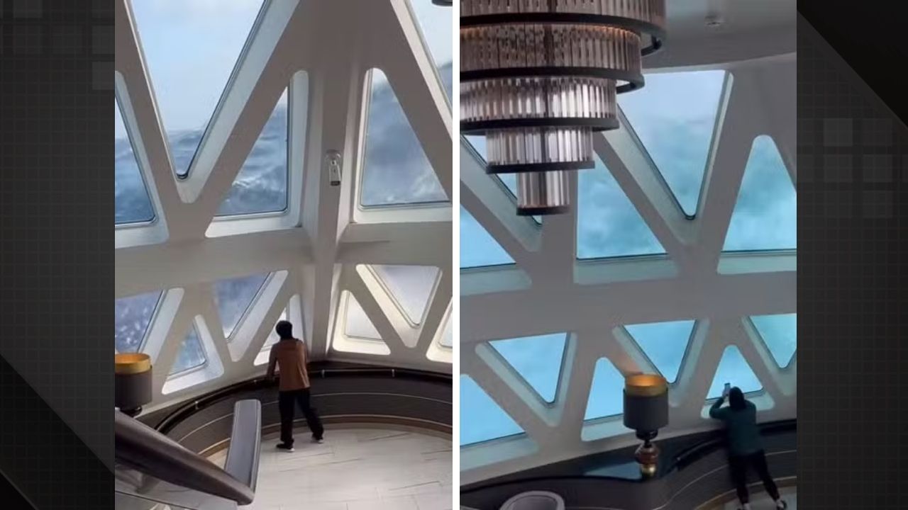 O registro mostra passageiros gritando enquanto as ondas gigantes balançam o barco. O impacto é tão grande que uma passageira chega a cair de costas no chão.