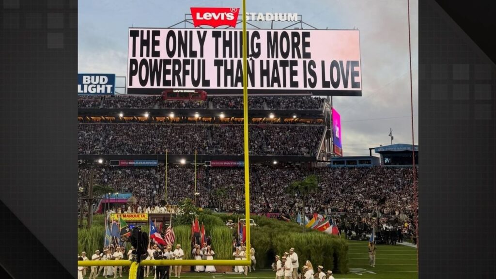 Durante toda a apresentação, Bad Bunny falou apenas uma frase em inglês: “Deus abençoe a América”. O artista citou todos os países do continente, incluindo os Estados Unidos, e resumiu a mensagem na frase exibida em uma bola de futebol americano: “Juntos, somos a América”.