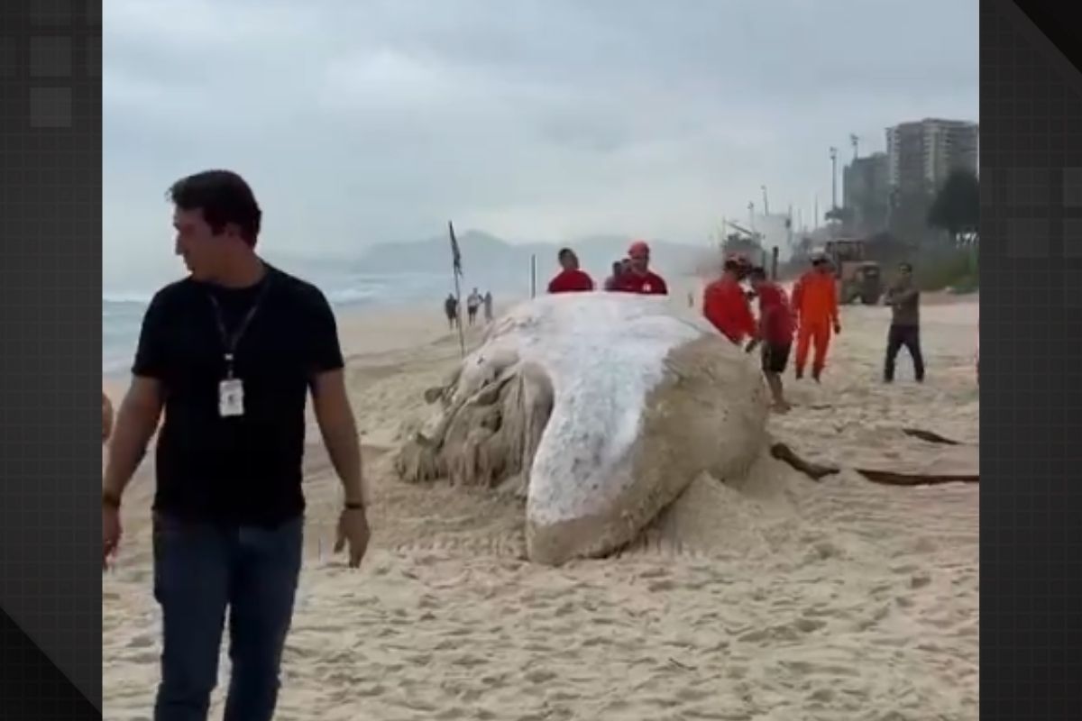 Baleia morta é encontrada encalhada na Praia da Barra, no Rio