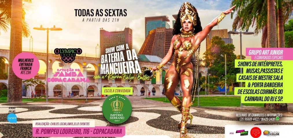 O carro-chefe da “Estação do Samba Copacabana” será o show semanal da bateria da escola de samba Estação Primeira de Mangueira, que além dos ritmistas contará com as passistas show e uma escola de samba convidada. A Agremiação que abrilhantará o evento neste final de semana é a coirmã Império Serrano, que não só levará a bateria como também intérprete, passistas e musas: