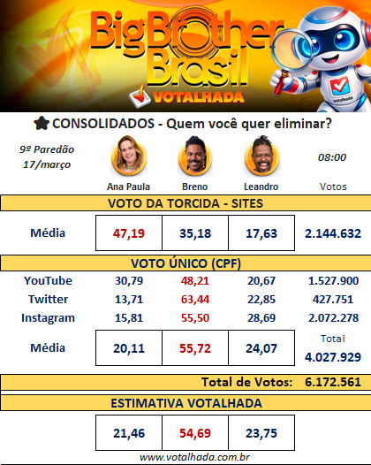 Nos votos únicos, que têm maior peso metodológico segundo o próprio BBB, o Votalhada aponta que Breno registra 54,69% de intenção de saída. Ana Paula fica com 21,46% e Leandro Boneco com 23,75%.