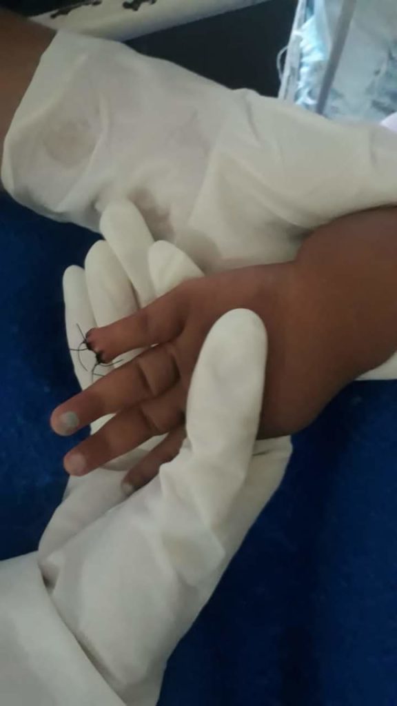 A menina recebeu os cuidados, colocou um acesso no braço pra fazer o tratamento com Antibiótico e com soro. Segundo a Adriana, que é avó da menina, quando a enfermeira foi cortar a atadura que estava segurando o acesso e cortou o dedo da criança.