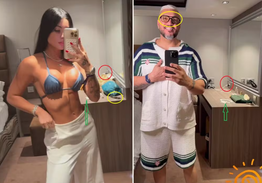 Segundo informações do Jornal Extra, é uma dessas cabines que o novo casal divide. O que ficou ainda mais claro ao se comparar as fotos no espelho para postar no Instagram que Belo e Rayane fizeram, do mesmo ângulo. Quem é mais atento vai reparar que o carregador de celular que aparece lá atrás no clique da modelo é o mesmo que surge na foto de Belo. E o óculos usado pelo cantor em sua selfie é o mesmo que horas antes estava na mesa, enquanto Rayane fazia pose. Um colar branco segue em cima da mesa, na mesma posição, em ambos os registros.