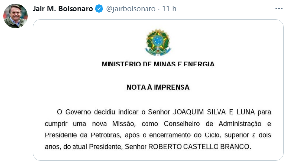 Em postagem nas redes sociais, Bolsonaro compartilhou uma nota oficial do Ministério das Minas e Energia oficializando a mudança no comando da estatal.