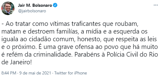 O presidente disse ainda, que ao tratar como vítimas traficantes que roubam, matam e destroem famílias, a mídia e parte da população os igualam ao cidadão comum, e parabenizou a Polícia Civil do Rio de Janeiro. Ele encerrou a publicação pedindo que Deus conforte os familiares do policial.