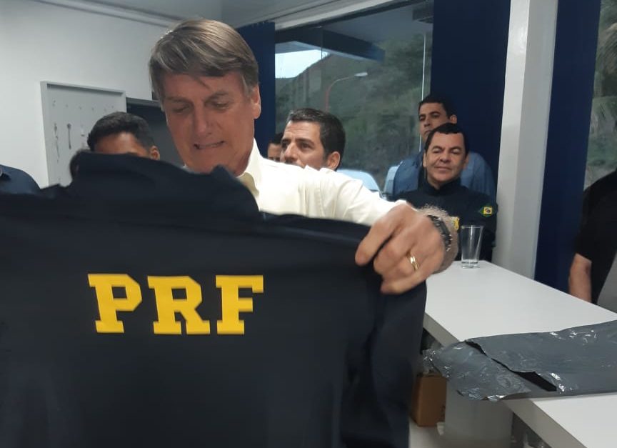 O presidente Jair Bolsonaro visitou a sede da Polícia Rodoviária Federal, em Barra Mansa, no Sul do Estado do Rio, na tarde desta sexta-feira (16). Bolsonaro foi presenteado com uma camisa táctica PRF pelo efetivo da Delegacia.