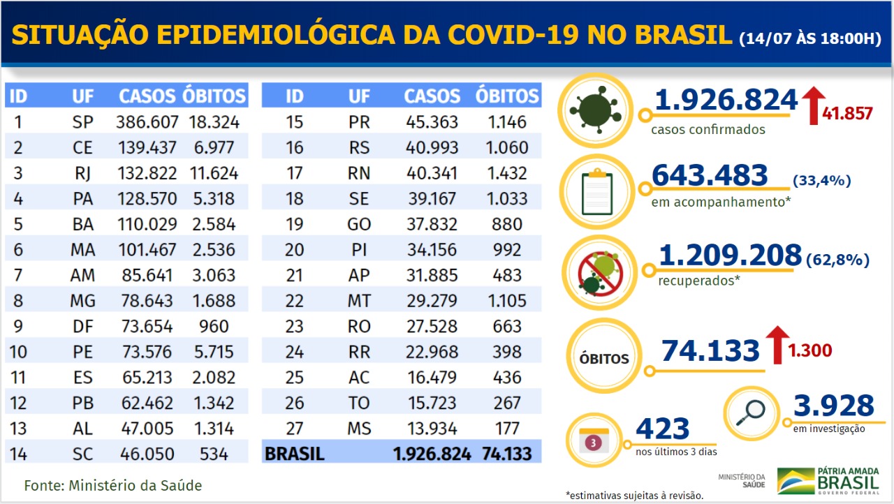 Em relação aos casos confirmados, o Brasil já soma 1.926.824 contaminados. Somente de segunda para terça, foram acrescentados aos dados oficiais mais 41.857 infectados. Já o número de pessoas recuperadas da Covid-19 é de 1.209.208 em todo o território nacional, enquanto outras 643.483 seguem em acompanhamento, que “são as ocorrências notificadas nos últimos 14 dias e que não evoluíram para óbito”.