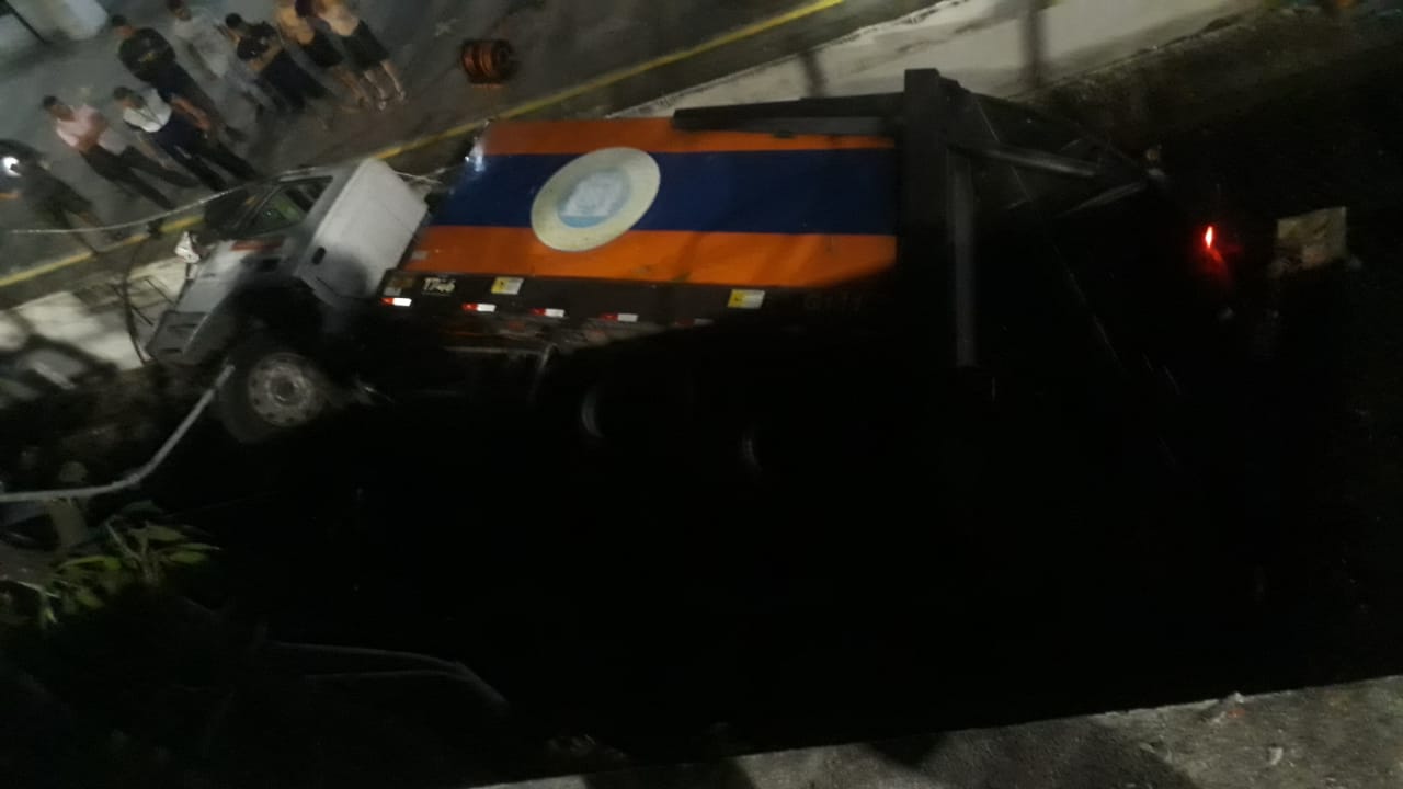 Caminhão da Comlurb cai de viaduto dentro da linha férrea da estação de trens de Realengo