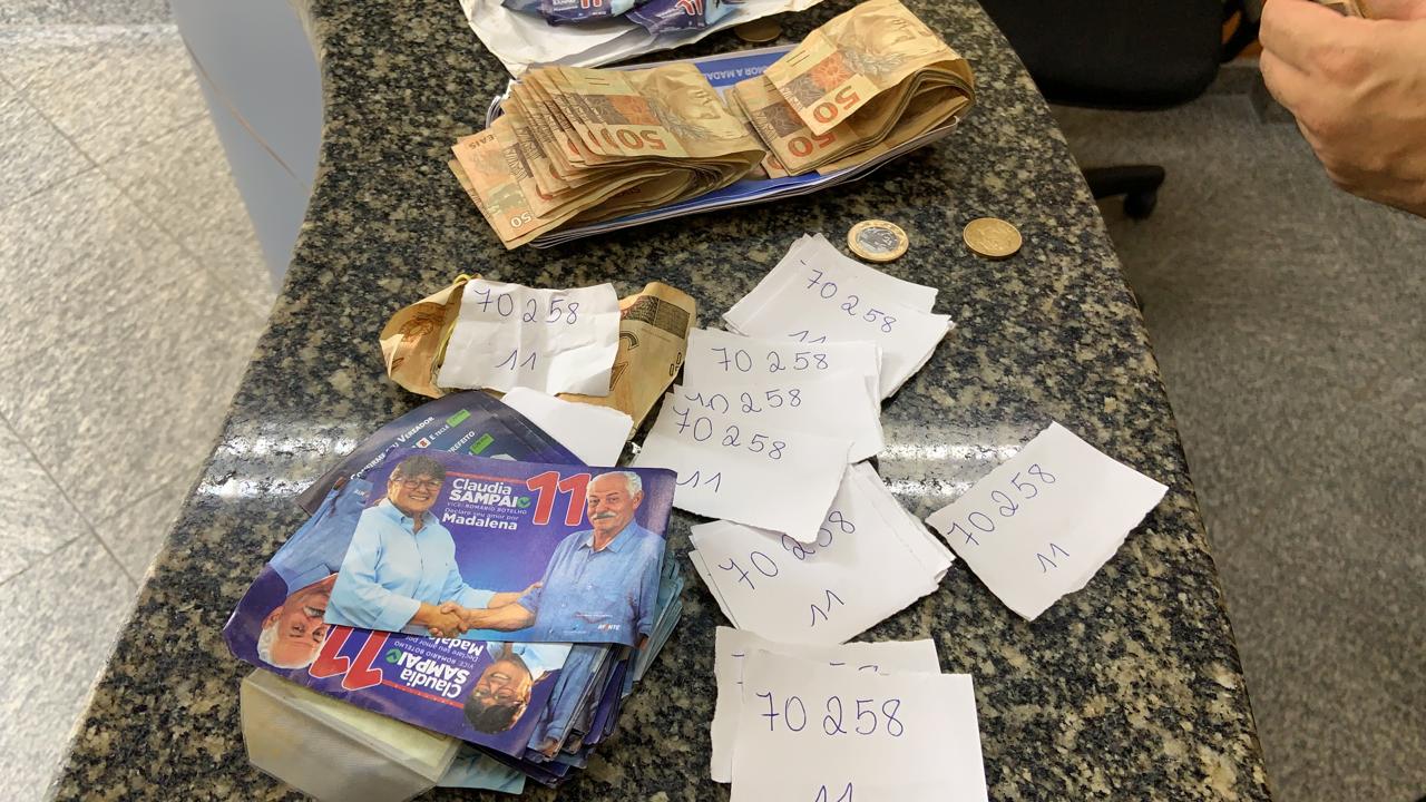 Com o candidato, foram apreendidos R$ 2.050 e 100 santinhos, além de panfletos da candidata a Prefeitura de Santa Maria Madalena Claudia Sampaio.