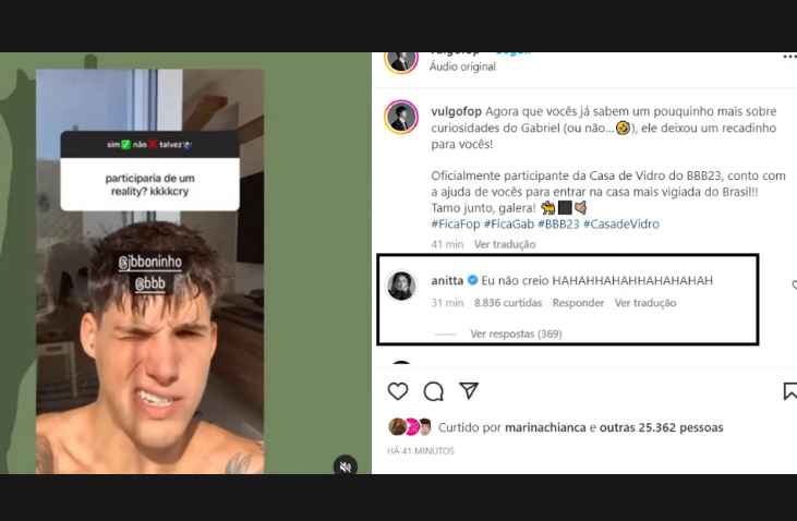 Os internautas já começaram a desenterrar vídeos e postagens dos participantes. Entre eles, acharam um vídeo em que o modelo é visto com Anitta.
