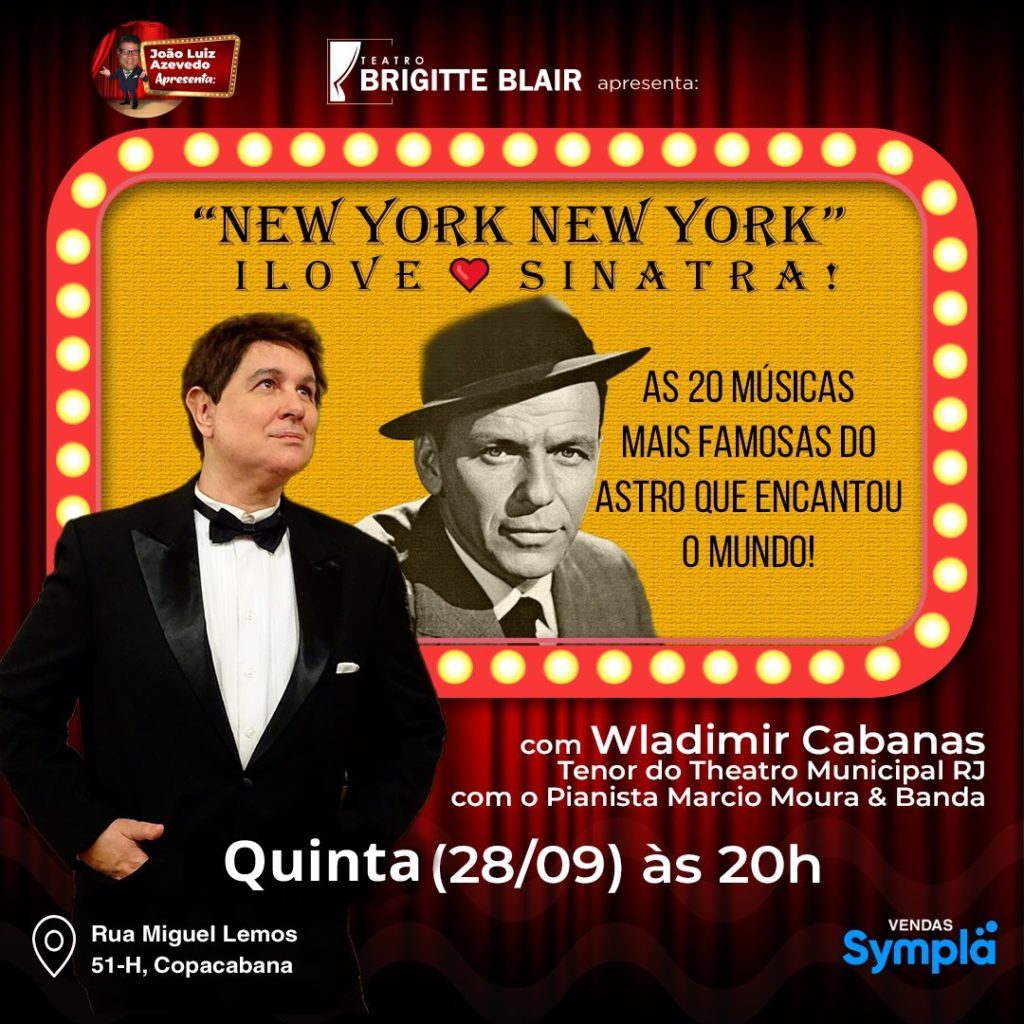 Neste show “New York, New York: I Love SINATRA!”, o cantor Wladimir Cabanas, apresentará os 20 maiores sucessos de Frank Sinatra, que faleceu aos 82 anos em Los Angeles, Califórnia, Estados Unidos, ao lado do pianista Marcio Moura & banda.