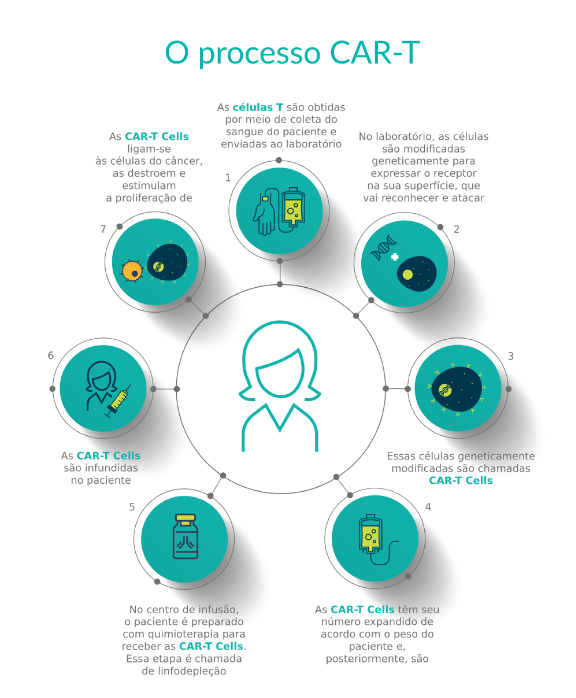 “São drogas vivas, chamadas de terapia celular, que aprimoram o sistema de defesa do paciente para que ele promova a cura através da destruição das células do câncer. Dentre elas, o CAR-T é uma nova modalidade de tratamento que, pela sua importância, insere-se como um novo pilar na jornada de tratamento do paciente, junto com a imunoterapia, quimioterapia e radioterapia. Nesse caso, no entanto, ela oferece uma resposta mais específica, pois trabalha de forma personalizada, guiada para tratar aquela célula, aquele câncer, aquela mutação, e não apenas de uma maneira geral, em todo o corpo”, analisa Renato Cunha, hematologista e líder do Programa de Terapias Gênicas do Grupo Oncoclínicas.