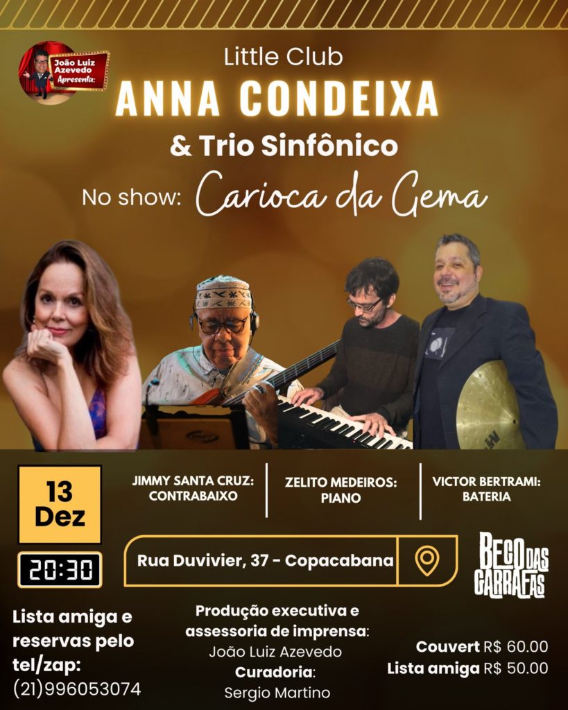 A cantora Anna Condeixa sobe ao palco do Beco das Garrafas, nesta quarta-feia (13), para apresentar o novo show “Carioca da Gema” onde apresentará sambas como ‘Desde que o Samba é Samba’ de Caetano Veloso, ‘Coração Leviano’ de Paulinho da Viola e ‘Ex Amor’ de Martinho da Vila.