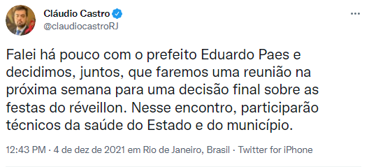 Segundo Castro, nesse encontro, irão participar técnicos da saúde do Estado e do município. Lembrando que na manhã desse sábado, o prefeito Eduardo Paes também usou as redes sociais para anunciar o cancelamento da tradicional festa que marca a passagem do ano.