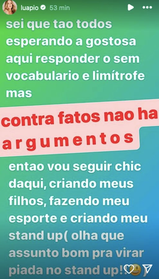 “Sei que estão todos esperando a gostosa aqui responder o sem vocabulário e limítrofe, mas contra fatos não há argumentos. Vou seguir chic daqui, criando meus filhos, fazendo meu esporte e criando meu stand up (olha que assunto bom pra virar piada no stand up!)”, escreveu.