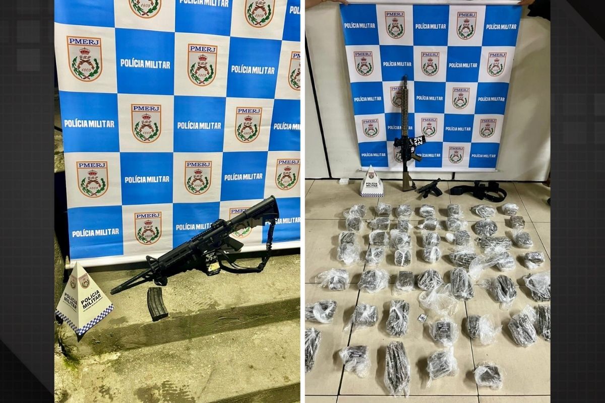 Os policiais apreenderam um fuzil, uma réplica de fuzil, uma pistola, um rádio transmissor, carregadores com munições, maconha e um veículo roubado.