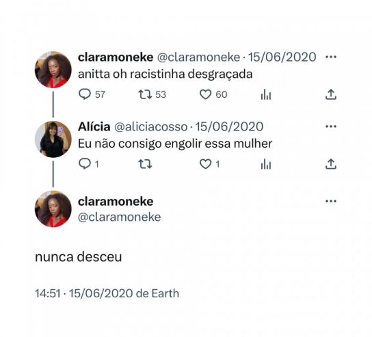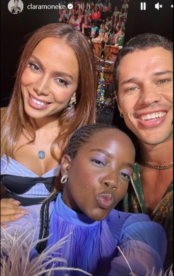 A atriz Clara Moneke, que fez sucesso em “Vai na Fé”, postou nas redes sociais uma foto em que aparece ao lado de Anitta e José Loreto durante uma gravação na Globo. Após a artista posar ao lado da cantora, os internautas resgataram uma postagem antiga de Clara no Twitter em que ela chama a Anitta de “racistinha”.