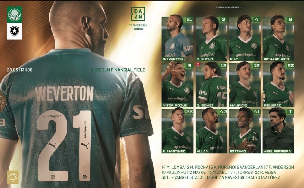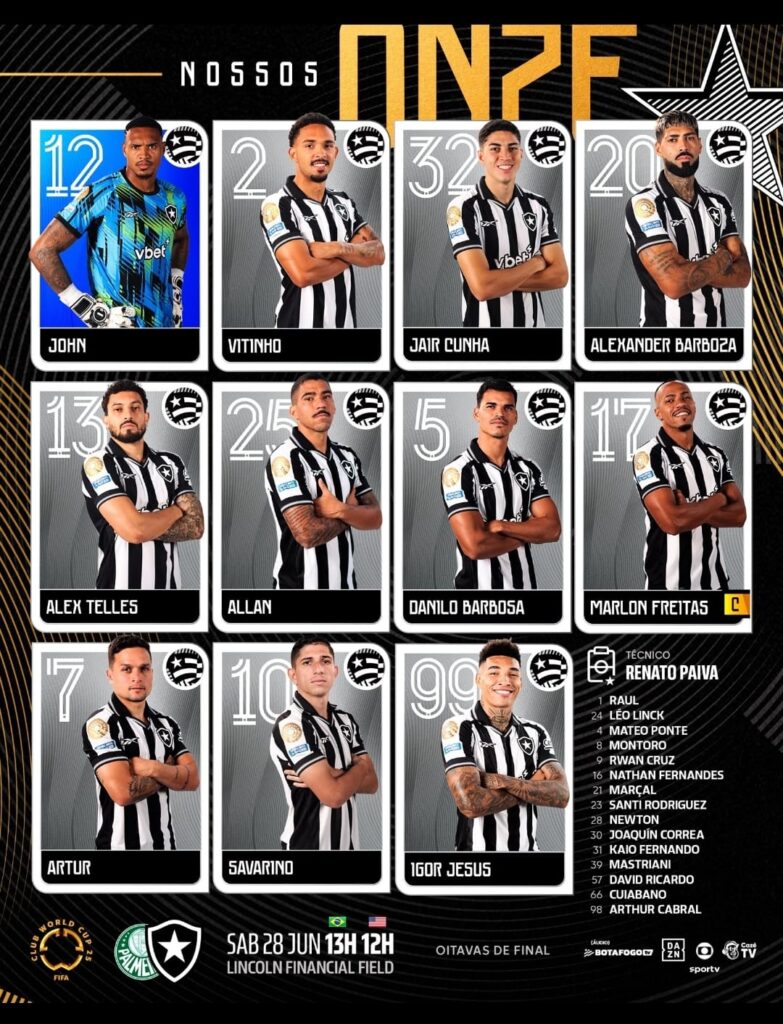 Neste sábado (28), o Botafogo enfrenta o Palmeiras, às 13h, no Lincoln Financial Field, pelas oitavas de final da Copa do Mundo de Clubes. Sem Gregore, que foi suspenso na última partida da fase de grupos contra o Atlético de Madrid, e foi substituído por Danilo Barbosa.